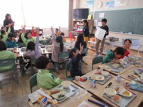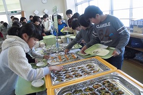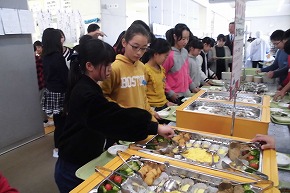 | 16日に6年生の恒例行事となっているバイキング給食がありました。給食センターの方から食べ物の栄養についてのお話をお聞きし、いよいよ給食開始。普段はないメニューや選べる楽しさなどいつもとは違った給食で、子どもたちもにこにこ笑顔で盛り付けをしていました。センターの方や担外の先生と一緒に楽しく会食しました。楽しい雰囲気の中、食欲も全開で何度もおかわりする子どもたちの姿も見られ、見事完食。6年生にとってまた素敵な思い出ができました。 |