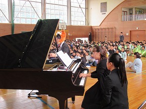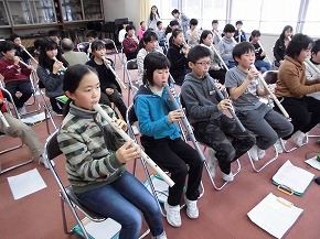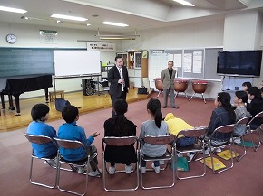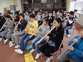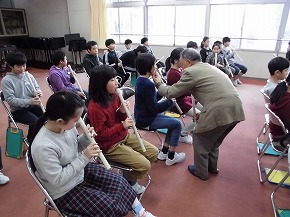 | 三曲協会の方々を講師にお迎えして、箏や尺八など日本の楽器に触れ、親しむ邦楽教室がありました。初めて触れる尺八は、音を出すのもたいへんで、子どもたちも悪戦苦闘していましたが、講師の方の丁寧なご指導やあたたかな励ましの言葉で何とか音が出るようになりました。また、箏も見たことはあるけれど、演奏するのは初めの子どもが多く、指に付ける爪にも興味津々で楽しく活動することができました。ご指導ありがとうございました。 三曲協会の皆様のすばらしい演奏も聴くことができ、日本の音楽をたくさん感じることができたよい体験になりました。 |