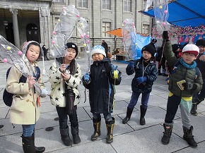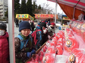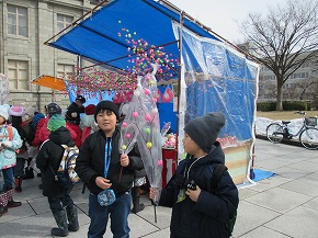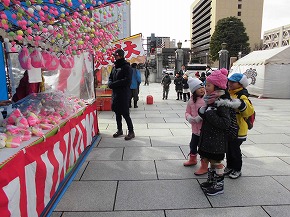 | 2年生みんなで、文翔館前広場で開催されている旧初市見学に行ってきました。子どもたちは持ってきたお小遣いで何を買おうかいろいろ迷いながらお店を見学していました。お店の人から昔の道具の説明を聞いたり、初市の雰囲気を感じたりしながら見学を楽しんでいました。初市らしい「だんご木」が子どもたちの買い物の人気だったようです。 |
