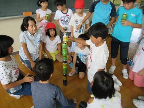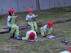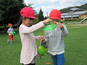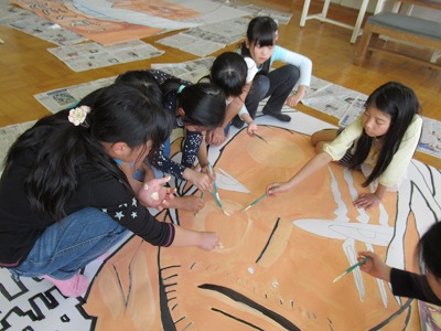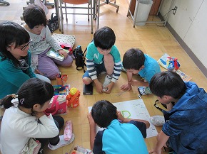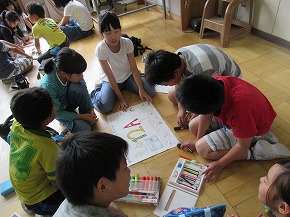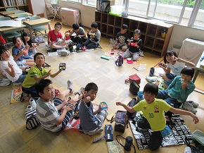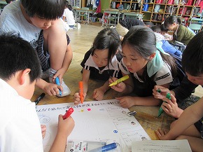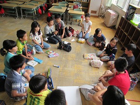 | うめばち班での縦割り活動が始まりました。今日は最初の活動ということで顔合わせの会を開きました。自己紹介の後、班のプラカードづくりにみんなで取り組みました。一人ひとりつくった自己紹介カードを画用紙に貼り、絵を描いたり、色を塗ったりしてプラカードを完成させました。 その後、弁当開きをしたり、一緒に遊んだりして楽しい時間を過ごしました。これから、いろいろなイベントを通してより仲良くなっていくことと思います。秋の全校芋煮会も楽しみです! |