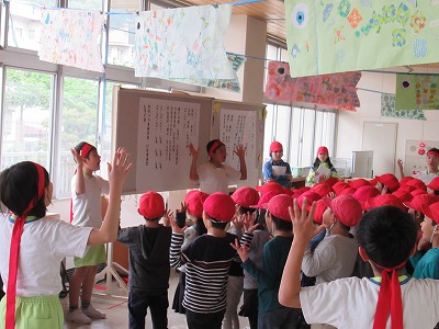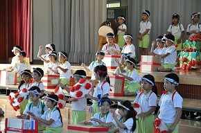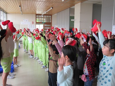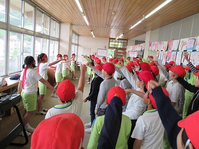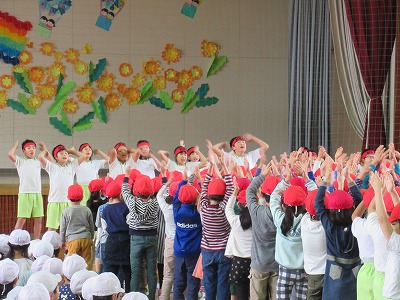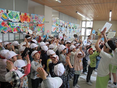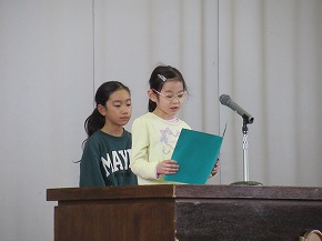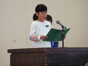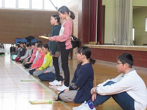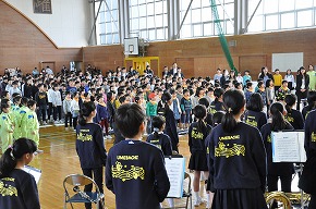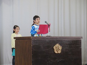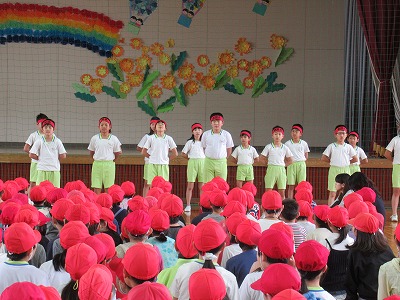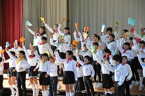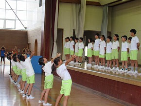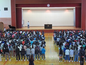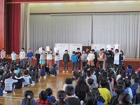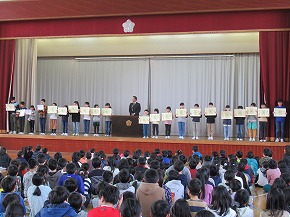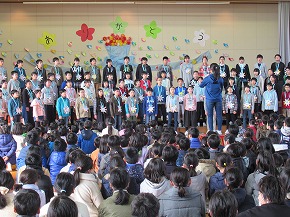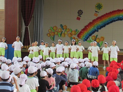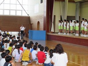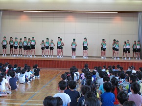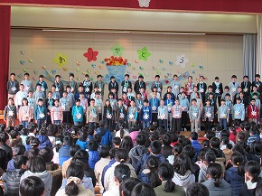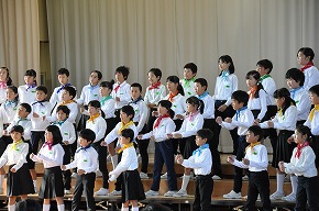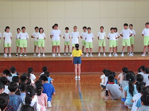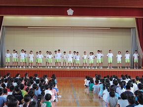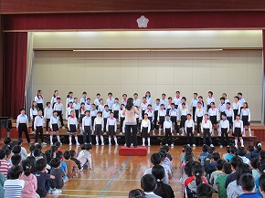 | 今日の全校朝会で、18日の市民合同音楽祭に出演する4年生の壮行式を行いました。白のシャツ、バンダナなどおそろいの服装で素敵な歌声を披露してくれました。当日も市民会館のホールいっぱい、すばらしい歌声を響かせてくれることでしょう。 (出演予定時刻は14:09です。) |