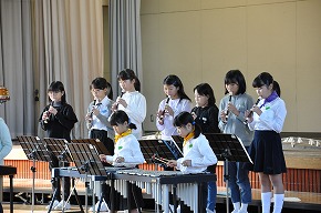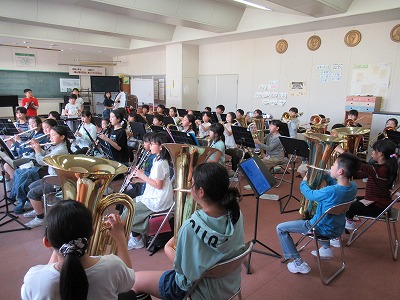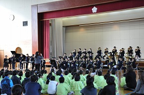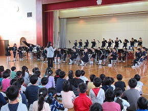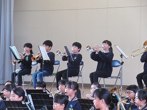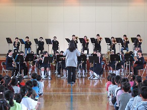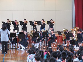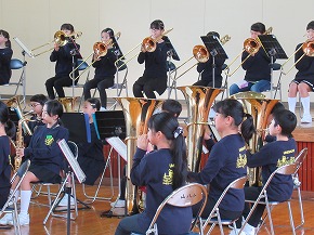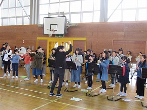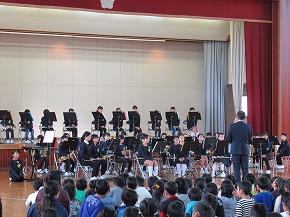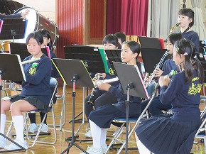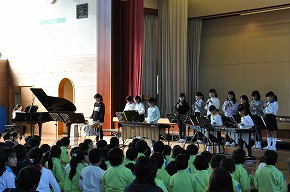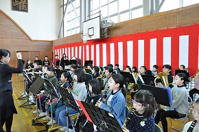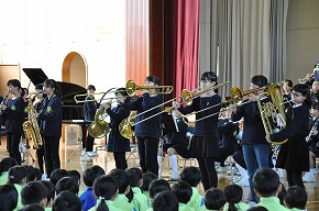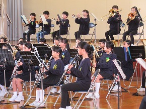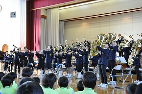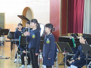| 明日開催される山形市小学校吹奏楽発表会に出演する吹奏楽部の壮行式を全校朝会で行いました。お揃いのトレーナーに身を包んだ4年生から6年生までの吹奏楽部の皆さんが、発表会で演奏する「明日も」を全校生の前で演奏しました。リズムに乗った素敵な演奏が体育館いっぱいに広がり、1年生も迫力ある演奏に聴き入っていました。明日の発表会では、今までの練習の成果を発揮し、豊かな八小サウンドを響かせてくれると思います。(演奏予定時刻は13:59です。) |