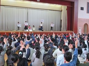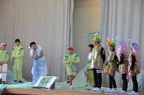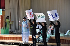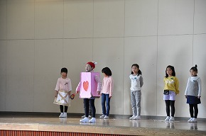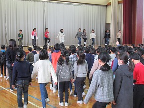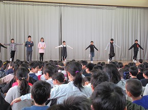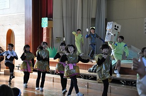 | これまでの学習の成果を発表する学習発表会を開催しました。たくさんの保護者の皆様にもご来校いただき、ありがとうございました。子どもたちも全校のみんなや保護者の皆様の前で発表し、大きな拍手をもらったことで満足げな表情でした。また、自分たちの学習の成果を発信できたことで大いに自信をもつことができたようです。これからの学習にも生かされていくことでしょう。 〜プログラム〜 全校合唱「Change!] 吹奏楽部「明日も/風になる」 校歌舞踊 3年総合的な学習の時間より「げんき学年 世界一周」 1年ダンス・朗族・歌「チャレンジいちねんせい パート1」 お琴・合奏クラブ「さくらさくら/いのちの記憶」 演劇クラブ「銭天堂 〜仲なおりくりぃむパン〜」 うめばち太鼓クラブ「6年オリジナル曲/うめばち太鼓」 2年群読・表現・リズム「わっしょい!かがやきまつり」 5年劇「かがやけ わたしたちの防災!」 4年合唱「ひびけ!空までとどくぼくらの歌声!!」 6年創作劇「未来へつなごう 美しい自然!」 どの学年も学習したことがみんなに伝わるように工夫された素敵な発表でした。また、クラブの発表や演奏もすばらしいものでした。6年生の発表では、最後を飾ったダンスにアンコールの声がかかり、2度目は全校のみんなで踊るなど大変盛り上がったフィナーレを迎えることができました。学習発表会の様子を写真で紹介します。 |