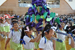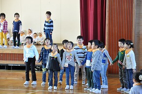 | 6年生のお兄さん、お姉さんと手をつないで、ドキドキワクワクの入場。花のアーチや大きな拍手で1年生を迎えました。歓迎の言葉のときは、まだ少し緊張していた1年生も〇×クイズやジャンケン列車などのゲームをするうちにすっかり笑顔になってきました。2年生からはアサガオの種のプレゼントがありました。また、2年生から6年生みんなの歌のプレゼントもありました。1年生からは、かわいい校歌の歌声がお返し。短い時間でしたが、1年生もすっかり八小の仲間になりました。1年生はこれから、朝会へも本格デビューです。 |