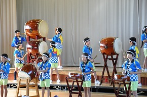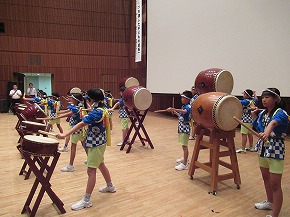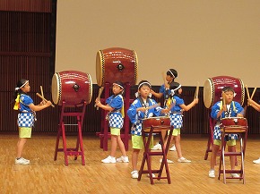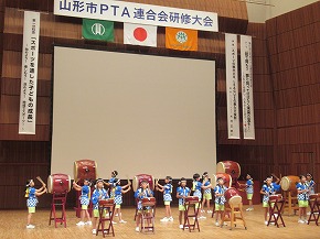 | 山形市PTA連合会研修大会開会式のオープニングでうめばち太鼓クラブの子どもたちによる「うめばち太鼓」の演奏が披露されました。新しいメンバーになって初めての演奏披露が山形テルサ大ホールということで、だいぶ緊張した様子でしたが、無事演奏することができました。大きな拍手をもらい子どもたちも満足げでした。4年生は6月からの活動開始ということで、クラブ活動の時間以外にも休み時間に練習する姿がよく見られました。学習発表会での演奏を目標にこれからもがんばっていってほしいと思います。太鼓の運搬等にご協力いただいた皆様、ありがとうございました。 |