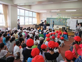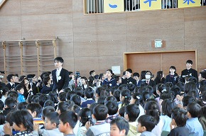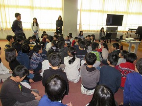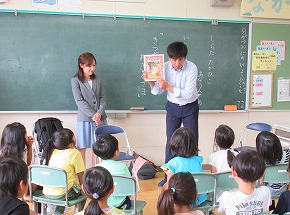 | さくらんぼテレビの白田貴彦アナウンサーと伊藤永夏アナウンサーをお招きして「アナウンサー先生」と題した出前授業を行いました。さすがお話のプロ、読み聞かせが始まると子どもたちはお話の世界に引き込まれるように聴き入っていました。大変有意義な体験をさせていただきました。 また、今週から教育実習が始まっています。音楽朝会の中で実習生の紹介を行いました。短い期間ですが、よろしくお願いします! |