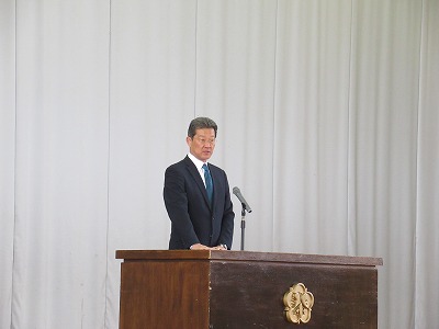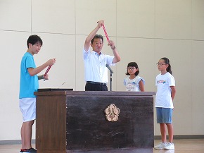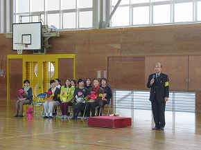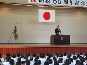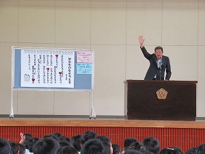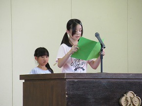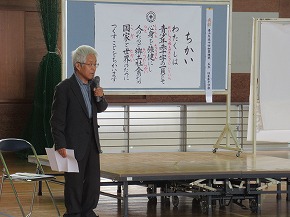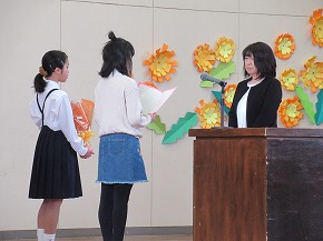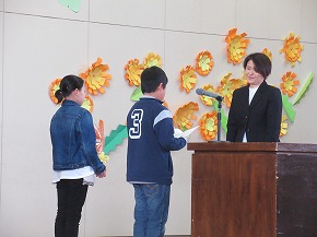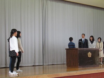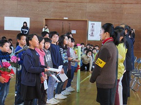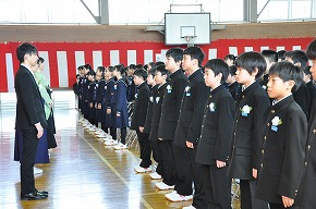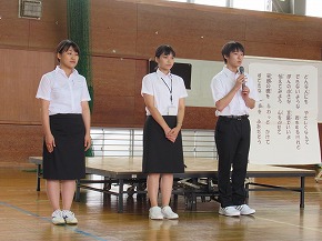 | JRCの講師の先生をお迎えして、青少年赤十字加盟式を行いました。4月に入学した1年生にJRCのバッジを講師の先生からいただき、新しいメンバーに加わりました。また、JRCの活動に取り組んで5年ということでいただいた感謝状を披露しました。最後に誓いの言葉を全校で唱和し、式を閉じました。 |