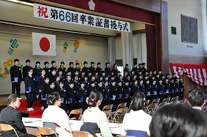| 澄み切った青空がひかり学年75名の卒業をお祝いしているようです。これからの決意がこもった力強い呼びかけや美しく響き合う歌声が体育館いっぱいに広がり、素敵な卒業式になりました。ご卒業、おめでとうございます! |