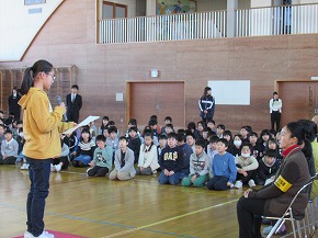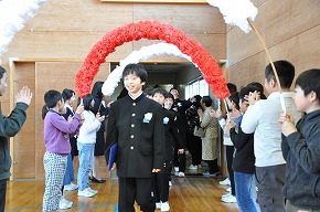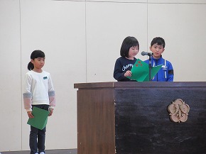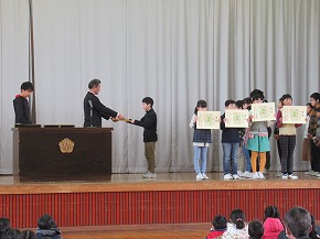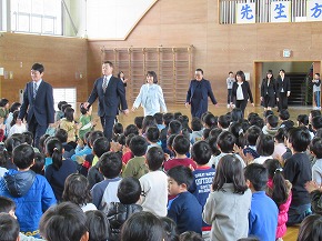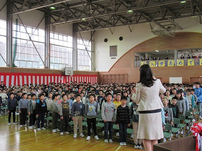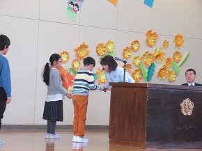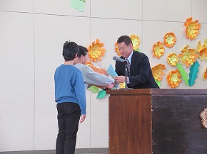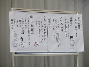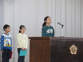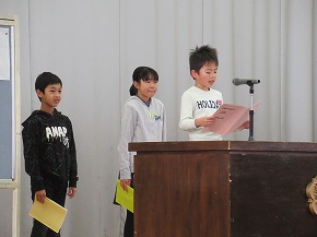 | 今日は1年間の締めくくりの修了式。校長先生から進級おめでとうや1年間の頑張りについてのお話がありました。代表児童の言葉では、3人ともしっかり今までの学習や活動を振り返り、4月からの目標を堂々と発表できました。 明日は、いよいよ卒業式です。「感動・感謝・憧れ」を胸に、みんなですばらしい卒業式を創りあげてほしいものです! |