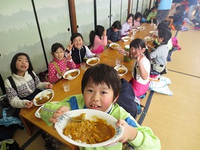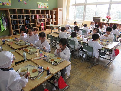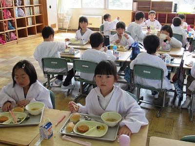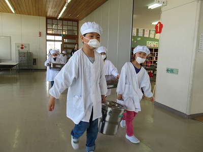 | 今日は1年生にとって初めての給食。給食着に着替えて、給食配膳室から食缶や牛乳などを持ってきます。ちょっと大変そうでしたが、みんなで分担して教室まで運びました。さあ、いよいよ盛り付けです。パンやジャム、スープなどみんなで一生懸命盛り付けたり、運んだりすることができました。初めてにしては、みんなとても上手でした。「おいしいよ!」という声がたくさん聞こえてきました。素敵なおいしい笑顔がいっぱいの給食でした。 〜今日の献立〜 パン 野菜スープ ささみチーズフライ 小松菜とツナのソテー みかんジャム 牛乳 |