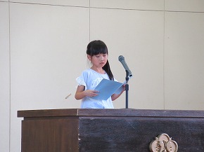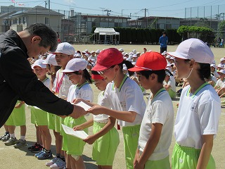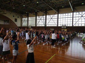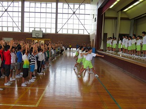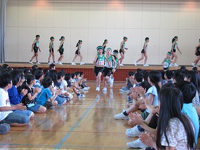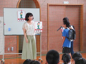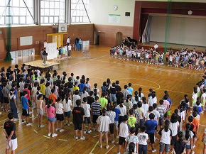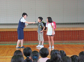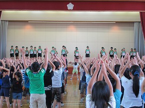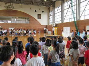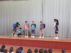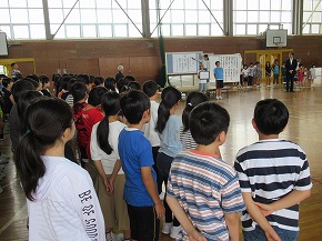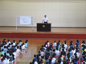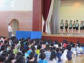 | 明日実施される水泳記録会の壮行式を全校朝会で行いました。選手入場の後、6年生の選手の皆さんが記録会での決意を力強く発表しました。また、5年生からは激励の言葉やエールが送られ、全校で選手の皆さんを応援しました。暑さが心配ですが、ベスト記録目指して、練習の成果を発揮してほしいと思います。 また、今日は全校で着衣水泳を実施しました。いざというときに大切な命を守れるよう学年の発達段階に応じて学習しています。もうすぐ夏休みです。事故なく楽しい夏休みを過ごせるようによろしくお願いします。 |
