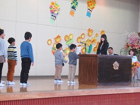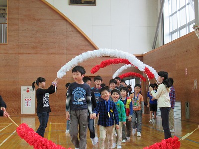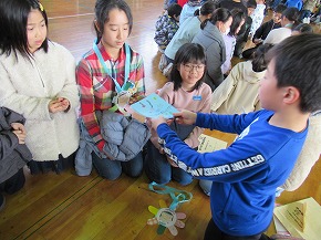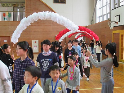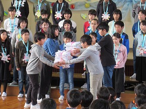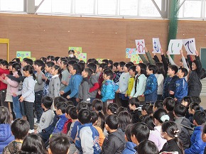 | 今まで学校のリーダーとしてみんなを引っ張ってくれた6年生に感謝の気持ちを伝える「6年生を送る会」が行われました。5年生を中心に準備を進め、各学年からのメッセージや歌、エールなど盛りだくさんのプログラムを上手に進めてくれました。たてわり班でゲームをしたり、お礼の手紙を渡したりしました。また、6年生からもメッセージ入りの栞や雑巾などのプレゼントもありました。卒業を前に楽しく心温まるすてきな会になりました。 |