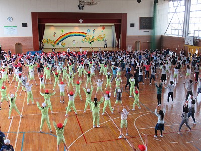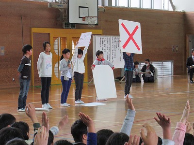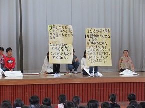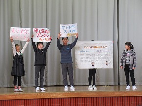 | 今日の全校朝会で保健整美委員会のみなさんが病気の予防について発表しました。バランスのよい食事や正しい睡眠、運動の大切さなどについて3択クイズや寸劇などをまじえて、楽しく分かりやすい発表で健康の大切さをみんなに伝えてくれました。また、ポテトチップス1枚分のカロリーを消費するために必要な運動やおすすめ体操など実際に体を動かす活動もあり、実感もともなった発表でした。 |