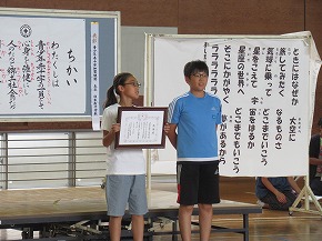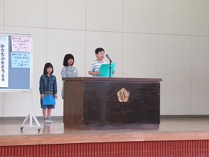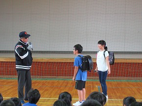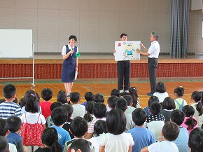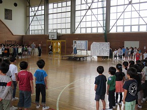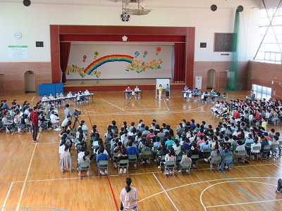 | 今日から第3シーズンが始まりました。夏休みに取り組んだ自由研究や工作などを手に子どもたちが元気に登校しました。教室は子どもたちの素敵な笑顔でいっぱいです。夏休みの楽しい思い出を聞くのが楽しみです。 第3シーズン最初の全校朝会ということで、2年生と4年生の代表の子どもたちがめあてを発表しました。また、夏休み中に開催された県選抜学童水泳記録会と県ジュニア駅伝競走大会に出場し、活躍したみなさんの表彰も合わせて行いました。 |