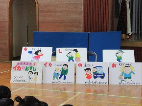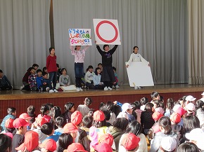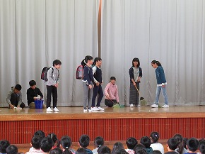 | 今日の全校朝会で計画委員会の発表がありました。計画委員の皆さんが、あいさつや廊下の歩き方についてクイズ形式で楽しく発表しました。児童会としても重点活動として取り組んでいます。明るいあいさつが響く八小をみんなでつくっていきましょう。また、赤い羽根募金運動についての呼びかけもありました。 |