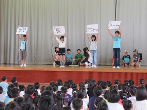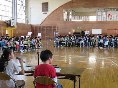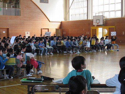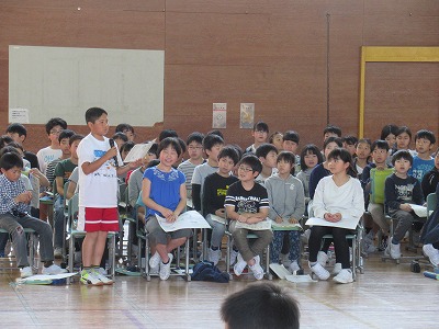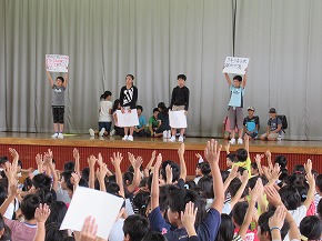 | 3年生以上の子どもたちが参加しての児童会総会が開かれました。児童会の目標について各クラスからたくさんの意見が出され、活発な話し合いになりました。一人ひとりが意見や思いをもち、自分事として考えていくことでよりよい児童会になっていくと思います。各委員会の活動計画も決まりました。すてきな児童会をみんなの手で創っていくよう主体的に活動に取り組んでいきましょう! |