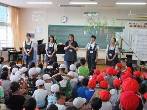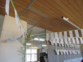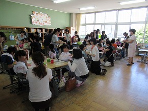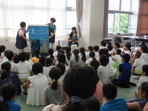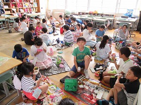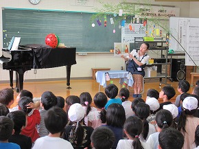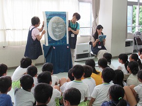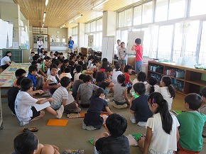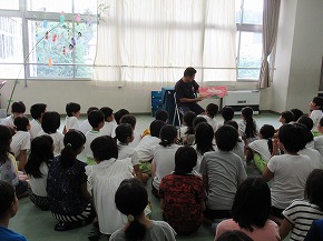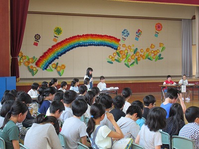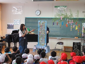 | いつも朝の時間に読み聞かせをしていただいている「よみきかせ隊」の皆さんによるお話会がロング昼休みに行われました。七夕の笹飾りがなされた上学年向けと下学年向けの2会場が設定され、たくさんの子どもたちが集まりお話会が始まりました。よみきかせ隊の皆さんのすてきな語りに子どもたちは引き込まれるように聴き入っていました。また、大判の絵本など子どもたちがびっくりするような仕掛けもあり、とても楽しいお話会になりました。 |