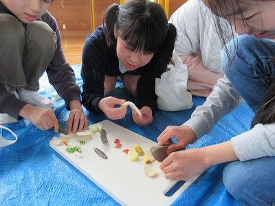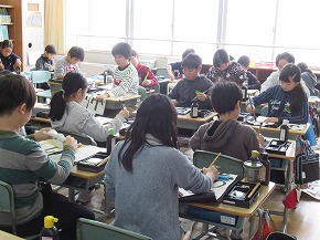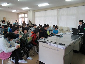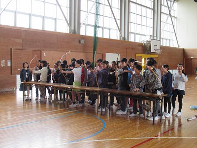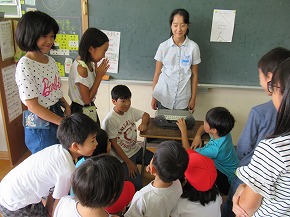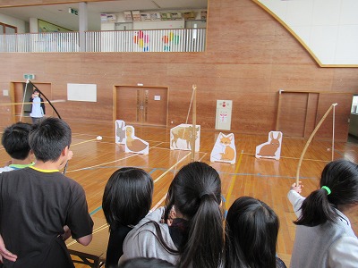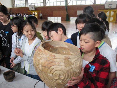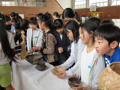 | 社会科の学習として、山形の埋蔵文化財や縄文時代のくらしなどについて、講師の先生をお招きしての学習会を開きました。写真などの資料を使って説明していただいた後、出土した土器や矢じりなどを手に取ってみたり、石包丁や狩猟体験などをしたりして学びを深めることができました。 |