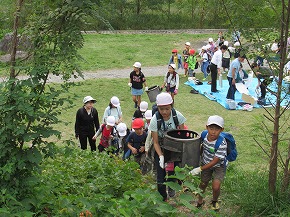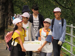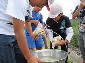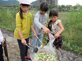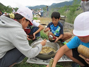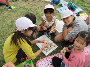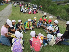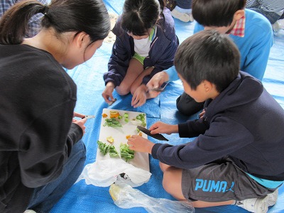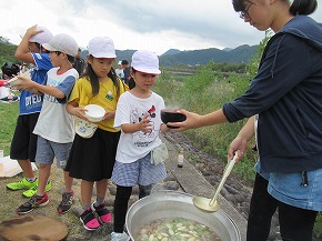 | 10日にうめばち班(縦割り班)で全校芋煮会を行いました。この芋煮会は八小の伝統となっている行事で、近くの馬見ヶ崎川原に全校生が移動し、1年生から6年生までのうめばち班みんなで協力して芋煮を作ります。6年生が中心となって準備を進め、当日はみんなで持ち物を分担して、川原に行きます。火起こしなどは高学年が行っていましたが、きのこやこんにゃくの準備には1・2年生もがんばって取り組んでいました。みんなの協力で芋煮ができあがり、みんなでおいしく食べました。爽やかな秋空のもと食べる芋煮の味は最高でした!また、最後はカレーうどんにしてどの班もきれいに完食、みんな満足げな表情でした。6年生がひとあし先に鍋洗いに学校に戻った後は、5年生が中心となってゴミ拾いや振り返りを行いました。うめばち班の絆がまた一段と深まり、素敵な思い出がまた一つできました。 |