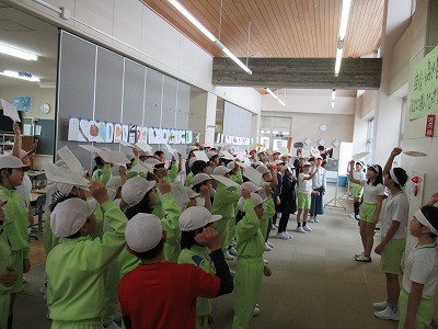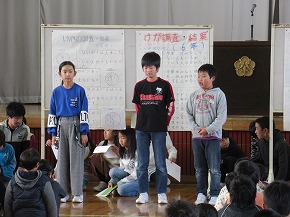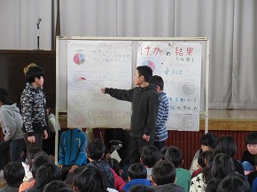 | 今日は委員会主催の行事など子どもたちが主体的に活動した場面が多い1日でした。全校朝会では、理科研究発表や造形展などの表彰があり、多くの子どもたちが校長先生から賞状を受け取りました。子どもたちのがんばりに拍手を送りたいと思います。また、5年3組のみなさんが全校のみんなからとったけがについてのアンケート結果をまとめた発表をしてくれました。けがをした場所や時間などを資料をもとに発表し、結果の傾向からけがをしないようにするには何に気を付けれなよいかを学年ごとにアドバイスしました。 給食の時間には、給食委員会が中心となって計画した交歓給食が行われました。複数の学年が集まり、クイズや話をしながら楽しいひとときを過ごすことができました。また、その後のロング昼休みには、集会委員会主催のゲーム集会が体育館で開催され、〇×クイズで大いに盛り上がりました。 |