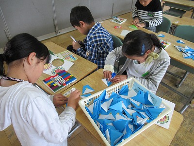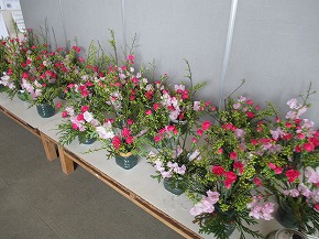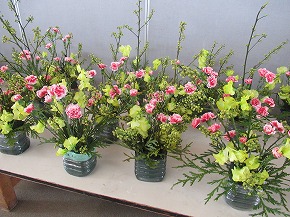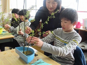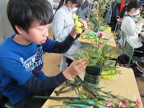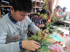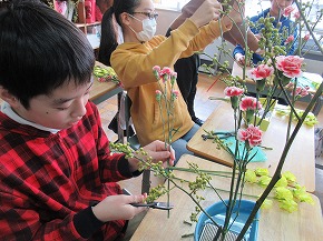 | 日本文化に親しむ体験学習の1つとして取り組んでいる「生け花教室」を行いました。講師の先生方から生け方の基本を教えていただいた後、本格的な花器と剣山に青もじやカーネーションなどを生けていきました。差す角度や長さなどをいろいろ考えながら生けている様子は真剣でした。後でオアシスに生け直して、お家の方への感謝の気持ちとともにプレゼントする予定です。 |