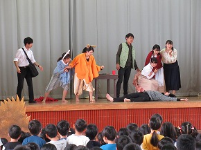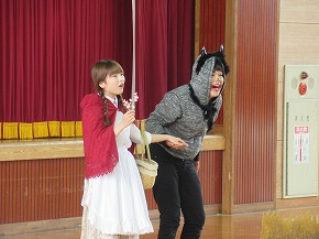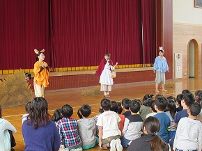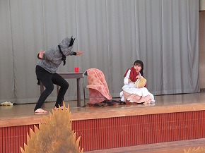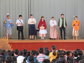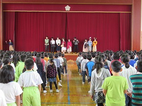 | 山形大学オペラ研究会YCMの皆さんが、オペレッタ「赤ずきん」を上演してくださいました。「オペラ鑑賞会」と題した鑑賞学習は、継続して行われているもので子どもたちも楽しみにしている行事です。よく知っているお話でも歌が入るとまた違った魅力があります。素敵な歌声に聴き入ったり、楽しい場面では笑い声が聞こえてきたりするなど子どもたちも楽しく鑑賞することができました。最後に、全校合唱をお礼にプレゼントしました。オペラ研究会の皆さん、ありがとうございました! |