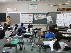 | 学習指導要領の改訂で2020年度から3・4年生は外国語活動が週1時間、5・6年生は外国語科として週2時間の学習が始まります。八小でも移行期として今年度からそれぞれ15時間授業時数を増やして学習を行っています。来年度は完全実施の予定です。 今年度は英語専科の先生を中心に担任やALT(英語指導助手)がチームを組んで学習に取り組んでいます。子どもたちも英語に親しみながら意欲的に学んでいます。 |