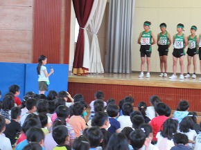 | 5日に陸上運動記録会が開催され、6年生の選手の皆さんが八小の代表として出場しました。当日の全校朝会では、5年生が中心となって選手の皆さんを激励する壮行式を行いました。激励の言葉や力のこもった応援でがんばってほしいという思いを選手のみんなに伝えることができました。そんな思いを受け取った選手全員が力の限りそれぞれの競技に取り組み、すばらしい記録を出すことができました。中でも、男子リレーチームは、3位入賞、県大会出場を決めました。おめでとう!応援いただいた保護者の皆様、ありがとうございました。 |