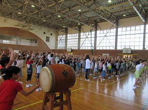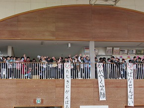 | エールの声や太鼓の音が校内に響き、いよいよ運動会が近づいてきました。 今月19日の運動会に向けて、運動会応援団の結団式が行われました。赤白両組の紹介の後、組頭がW優勝目指して力強く呼びかけ、それぞれの応援を披露し、みんなの気持ちも運動会に向けて盛り上がってきました。また、9日からは応援練習も始まりました。 |