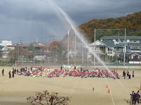 | 今日は防災訓練を行いました。大きな地震が起き、校内火災が発生したという想定での訓練でした。机の下にもぐって身の安全を確保したり、防火シャッター・扉が閉まった状態で避難したりなど、いつもとは違った訓練内容に子どもたちは真剣な表情で取り組んでいました。グラウンドに避難した後は、消防署の方のお話をお聞きし、放水訓練や消火訓練を見たり、体験したりしました。災害はいつ起こるか分かりません。自分の命は自分で守れるように今日の訓練内容も含め、安全な行動や知識をしっかり身に付けておくことが大切です。 |