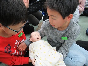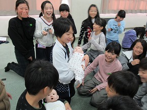 | 講師として助産師の先生をお迎えして、4年生のいのちの学習会を実施しました。音楽が流れるなど子どもたちが視聴覚室に入るところから雰囲気をつくり、自分たちが誕生した奇跡や体のしくみ、いのちの大切さについて資料を使いながら分かりやすく教えていただきました。また、実際の赤ちゃんと同じ大きさ、重さの人形を抱かせてもらい、子どもたちは学んだことについて実感をもって深めることができました。 |