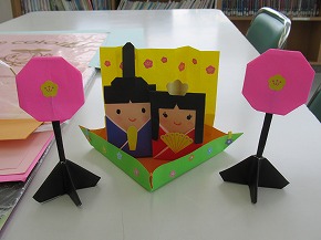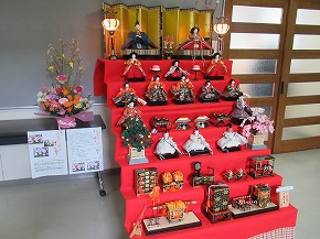 | もうすぐ3月、桃の節句が近づいてきたということで、校長室前に雛人形を飾りました。 |