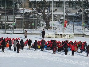 | 今年度6回目の防災訓練を行いました。今回は積雪時の避難という想定で、雪が積もったグラウンドへ避難しました。今までとは違って滑りやすい状況でしたが、慌てずスムーズに避難することができました。冬期間は火を使う機会も多い季節です。今まで以上に気を付けていきたいものです。 |